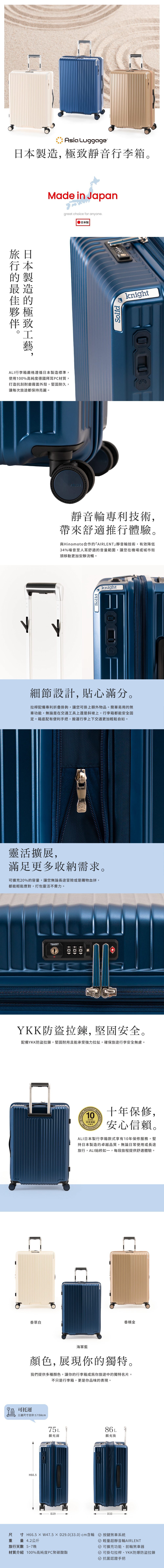 【10年保修,安心信賴】ALI日本製行李箱款式享有10年保修服務,堅持日本製造的卓越品質,無論日常使用或長途旅行,ALI始終如一,每段旅程提供舒適體驗。