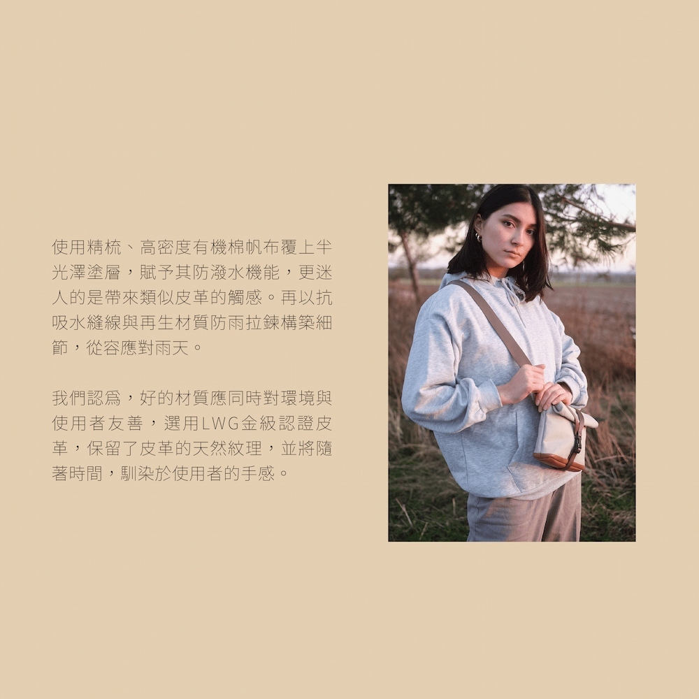 材質:塗層有機棉、LWG 認證植鞣牛皮