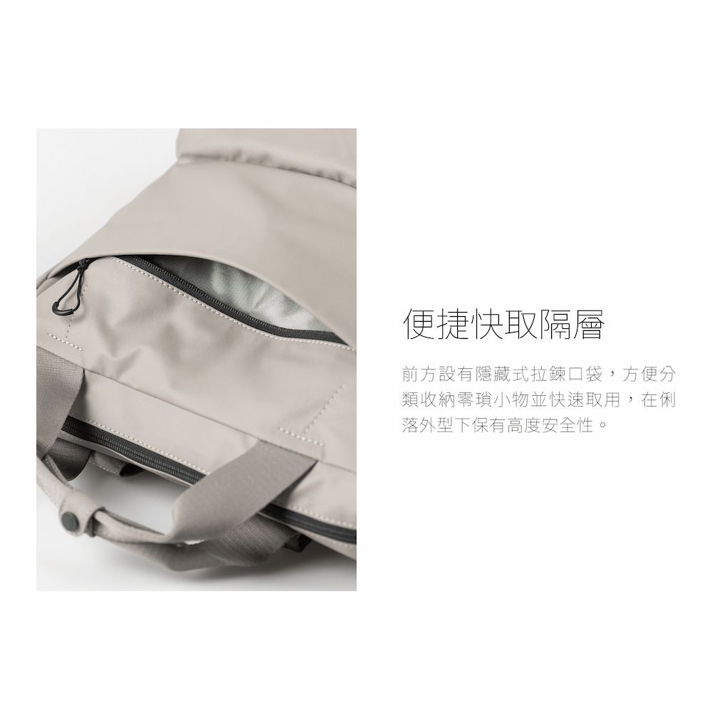 便捷快取隔層,前方隱藏拉鍊口袋,讓小物分類收納更方便,取用即時。