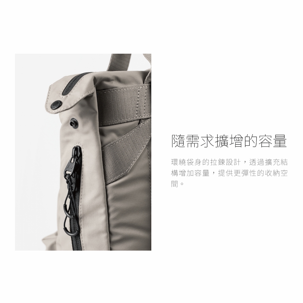 環繞袋身的拉鍊結構,輕鬆擴充容量,收納更靈活。