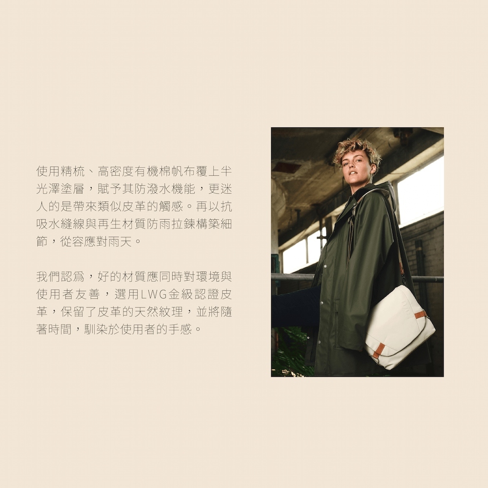 材質:塗層有機棉、LWG 認證植鞣牛皮