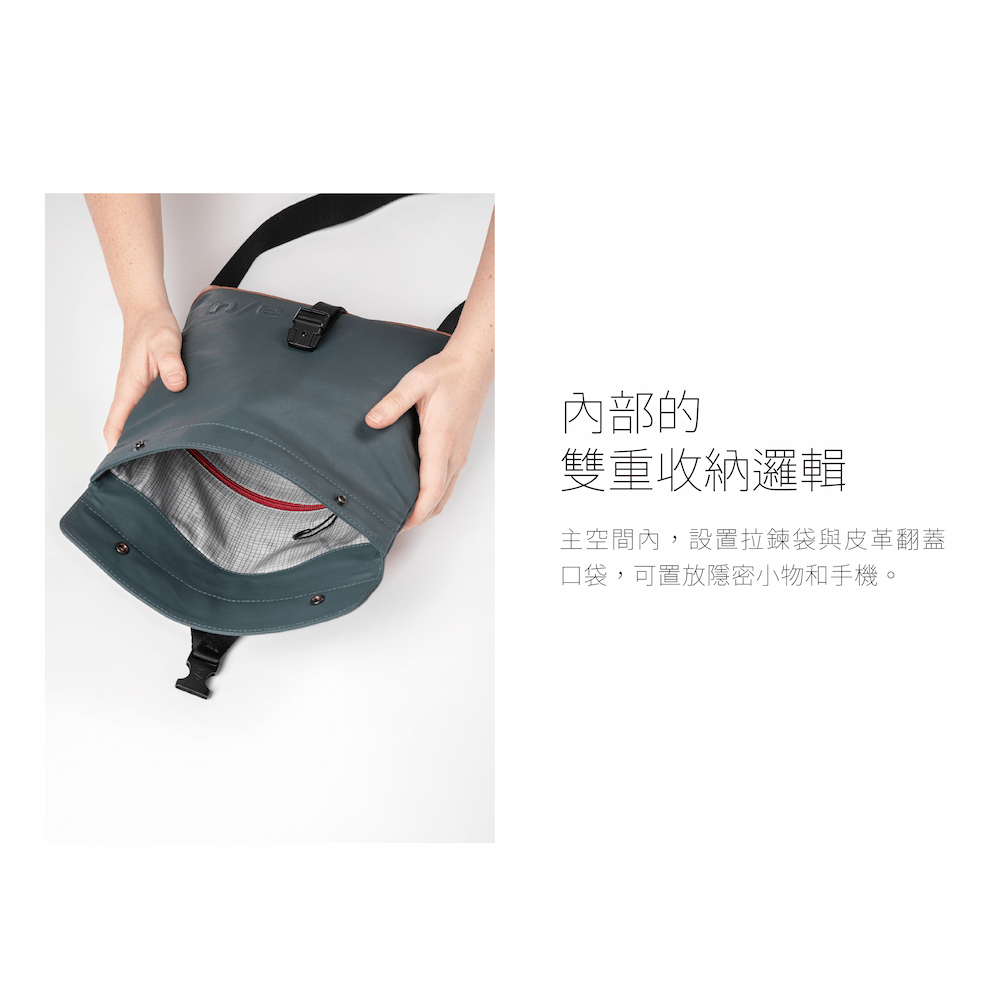 ◆內部的雙重收納邏輯| 主空間內,設置拉鍊袋與皮革翻蓋口袋,可置放隱密小物和手機。