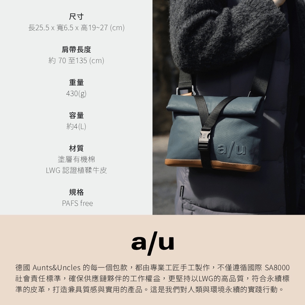 德國Aunts & Uncles 的每一個包款,都由專業工匠手工製作,不僅遵循 國際SA8000 社會責任標準,確保供應鏈夥伴的工作權益,更堅持以 LWG 的高品質,符合永續標準的皮革,打造兼具質感與實用的產品。這是對人類與環境永續的實踐行動。