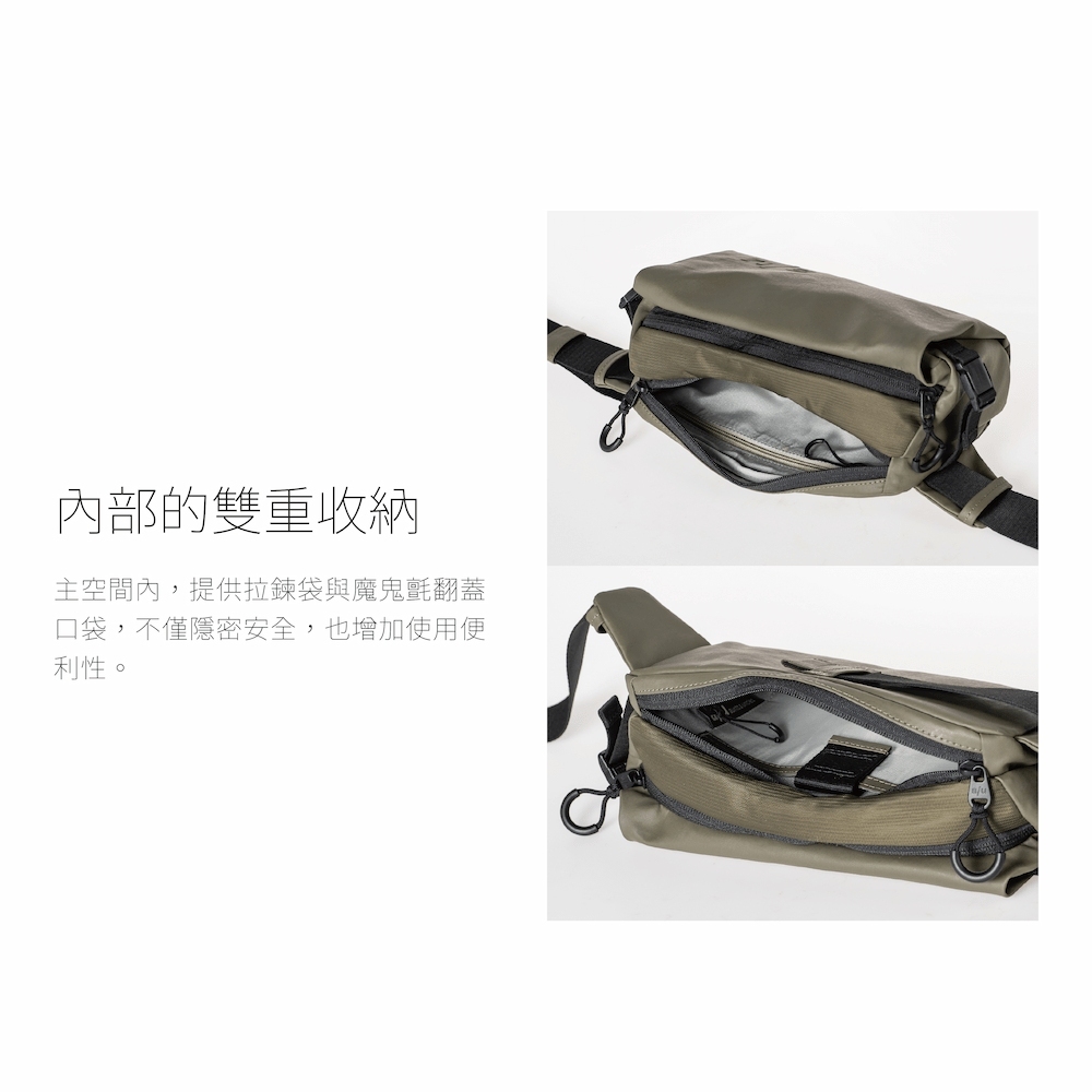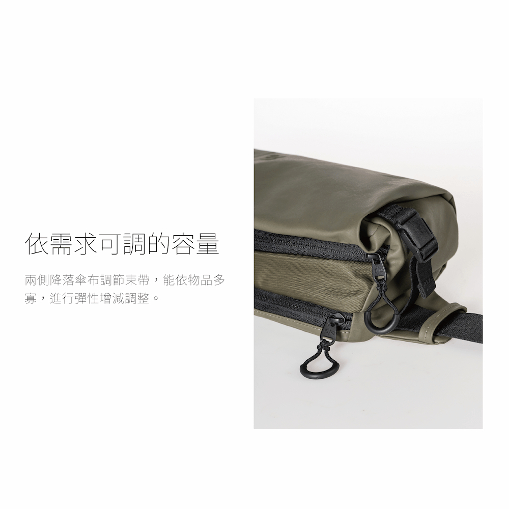 ◆依需求可調的容量|兩側降落傘布調節束帶,能依物品多寡,進行彈性增減調整。