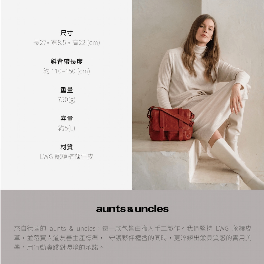 德國Aunts & Uncles 的每一個包款,都由專業工匠手工製作,不僅遵循 國際SA8000 社會責任標準,確保供應鏈夥伴的工作權益,更堅持以 LWG 的高品質,符合永續標準的皮革,打造兼具質感與實用的產品。這是對人類與環境永續的實踐行動。