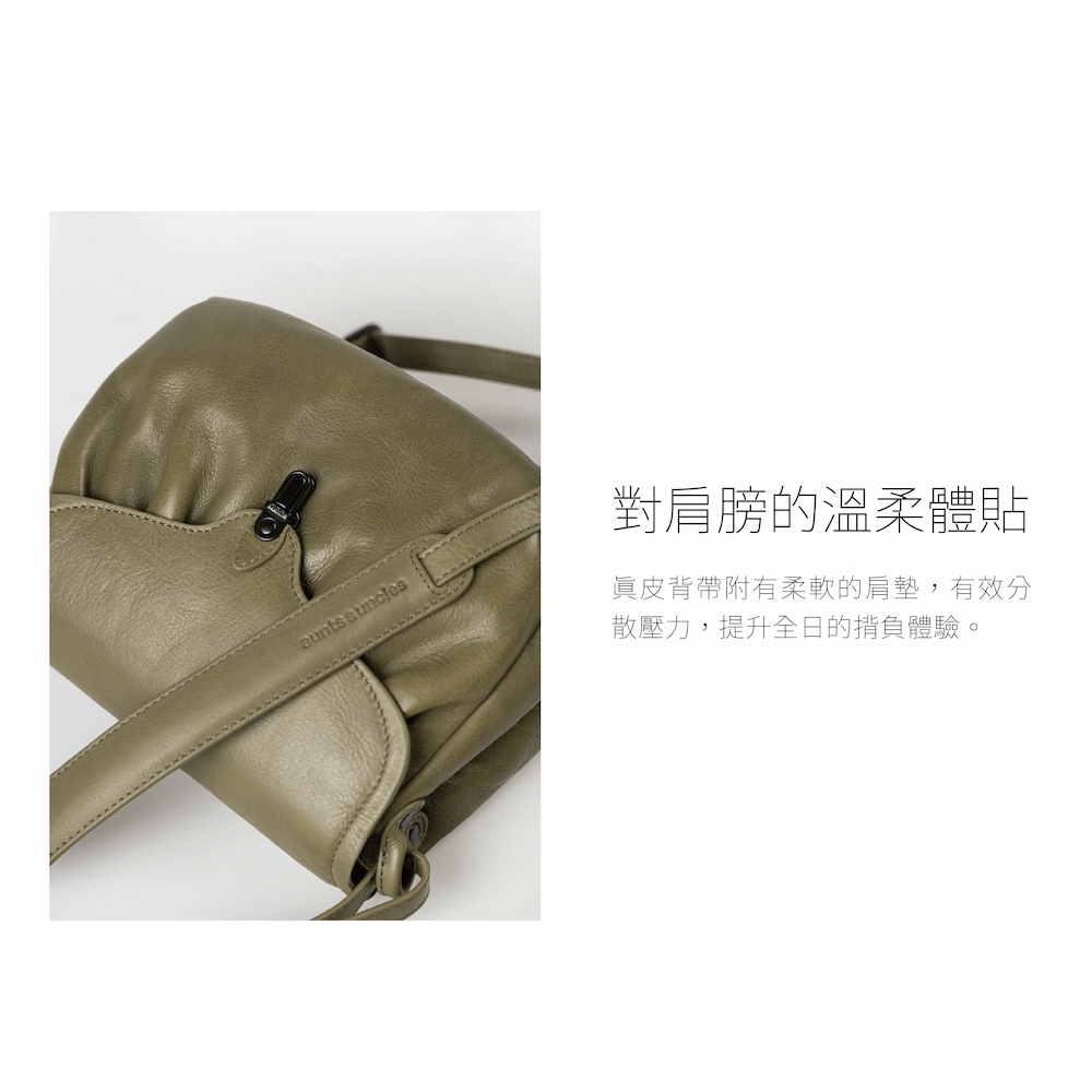 真皮背帶附柔軟肩墊,分散壓力,提升全天揹負舒適度。