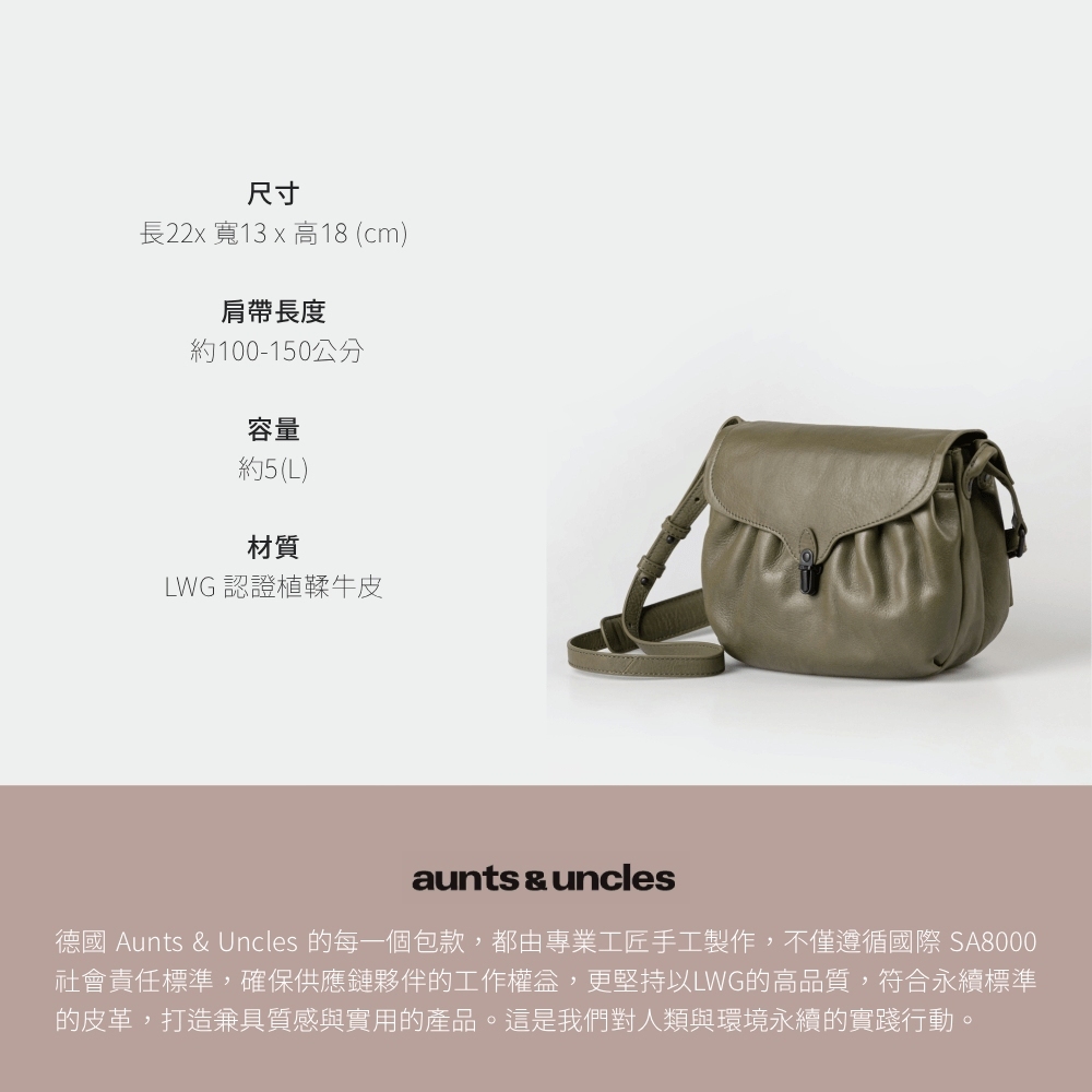 德國Aunts & Uncles 的每一個包款,都由專業工匠手工製作,不僅遵循 國際SA8000 社會責任標準,確保供應鏈夥伴的工作權益,更堅持以 LWG 的高品質,符合永續標準的皮革,打造兼具質感與實用的產品。這是對人類與環境永續的實踐行動。