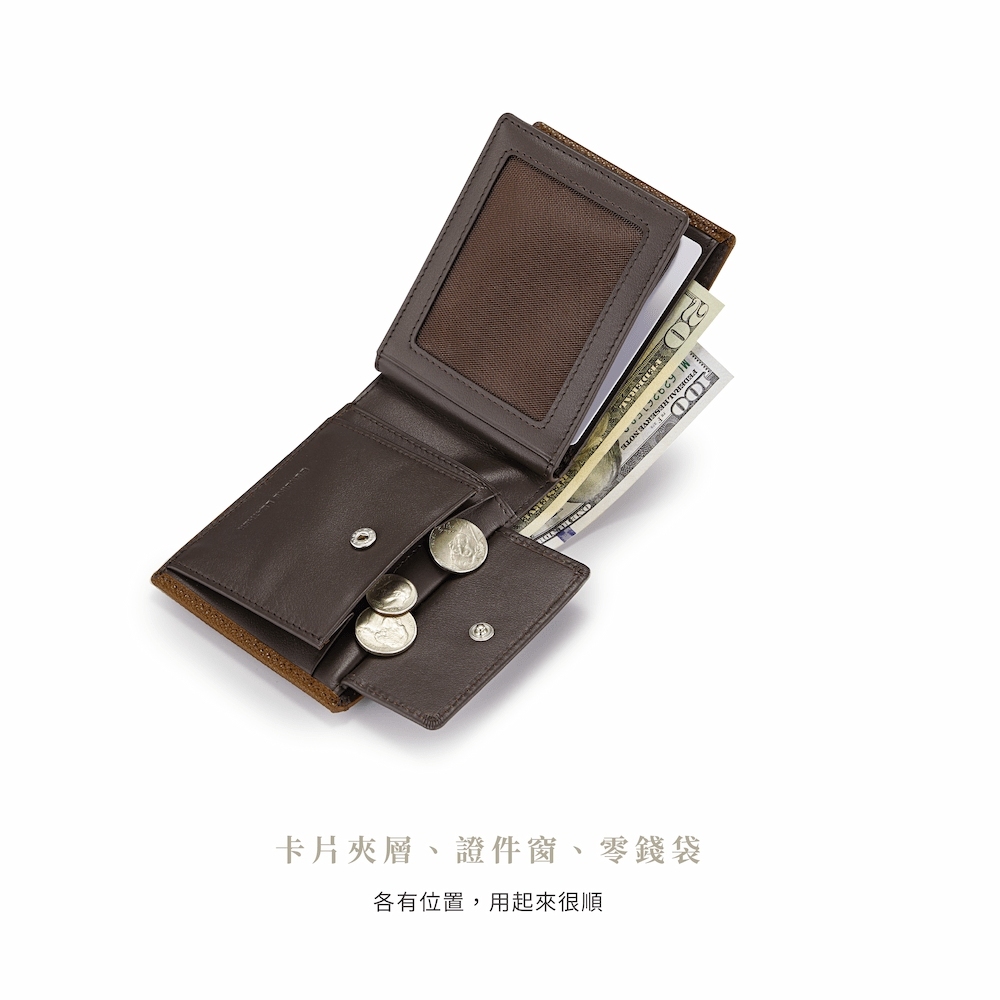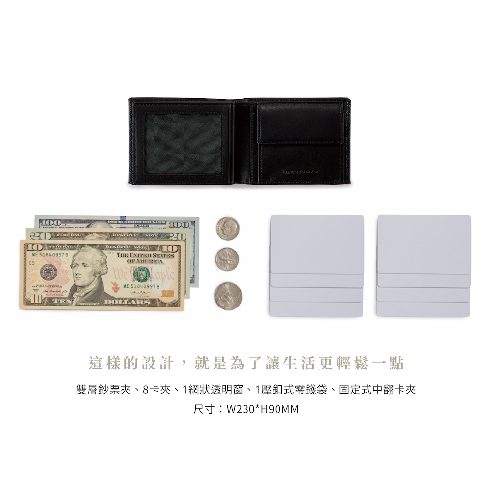 說明:雙層鈔票夾/8卡夾/1網狀透明窗/1壓釦式零錢袋/固定式中翻卡夾