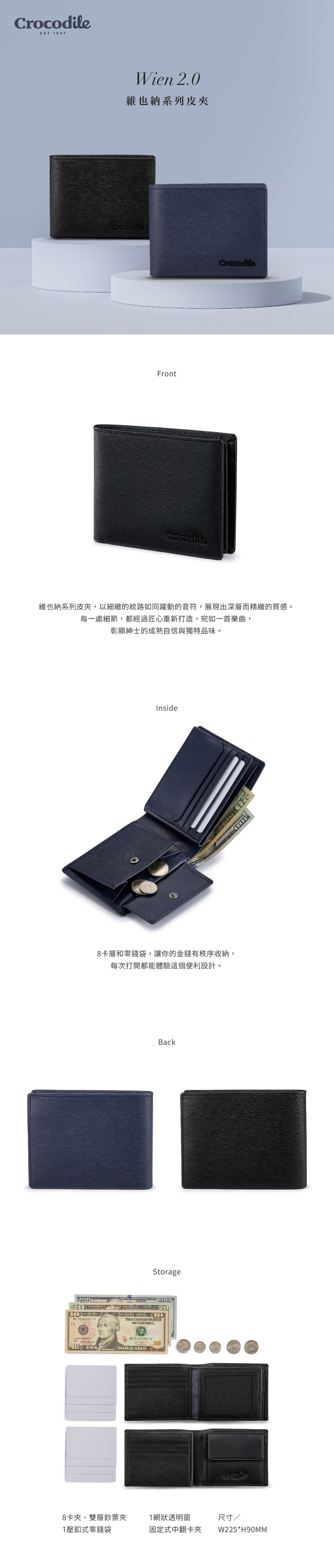 說明:雙層鈔票夾/1壓釦式零錢袋/8卡夾/1網狀透明窗/固定式中翻卡夾