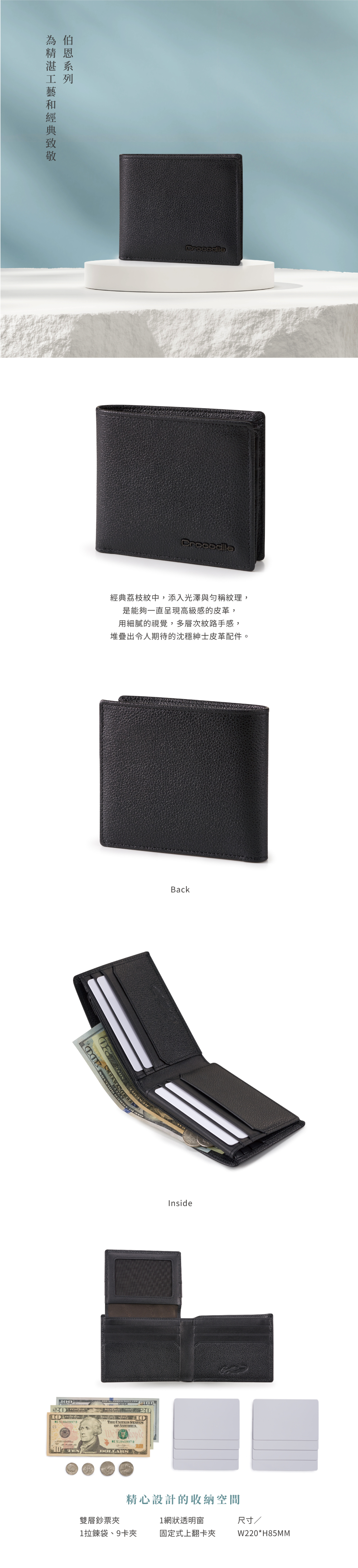 說明:雙層鈔票夾/1拉鍊袋/9卡夾/1網狀透明窗/固定式上翻卡夾