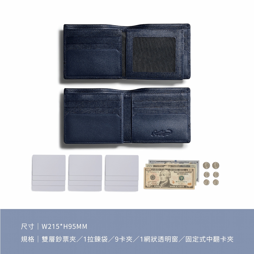 說明:雙層鈔票夾/1拉鍊袋/9卡夾/1網狀透明窗/固定式中翻卡夾