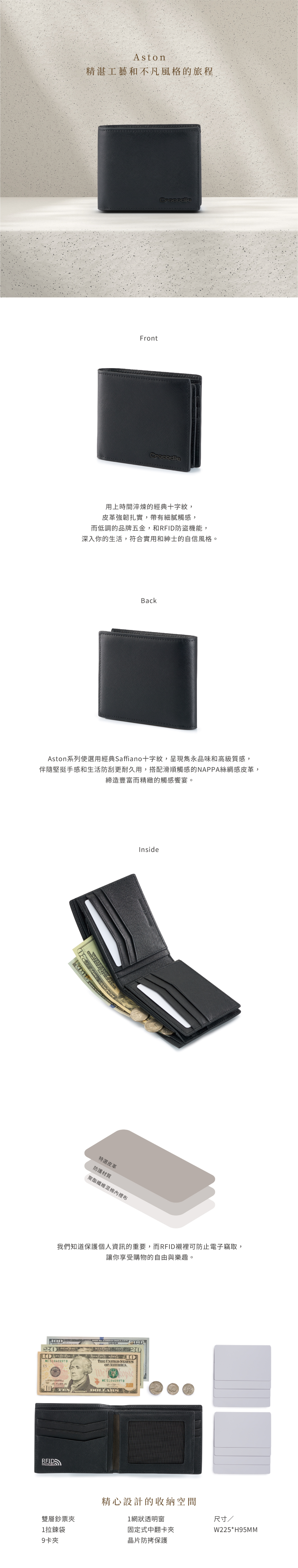 說明:雙層鈔票夾/1拉鍊袋/9卡夾/1網狀透明窗/固定式中翻卡夾/晶片防拷保護