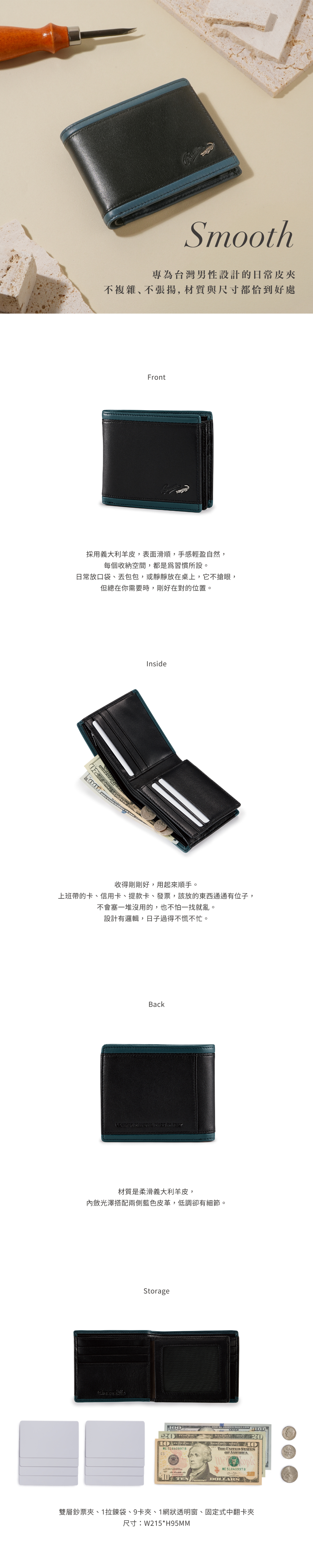 說明:雙層鈔票夾/1拉鍊袋/9卡夾/1網狀透明窗/固定式中翻卡夾
