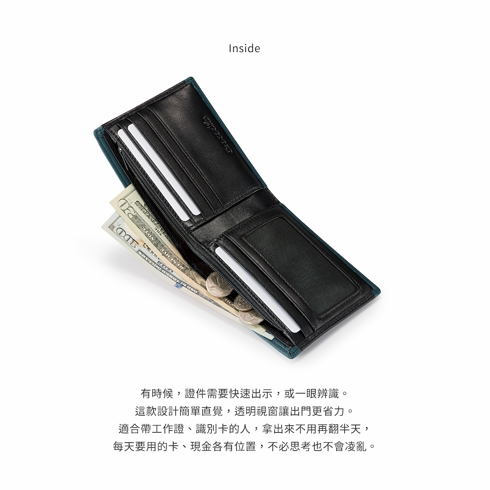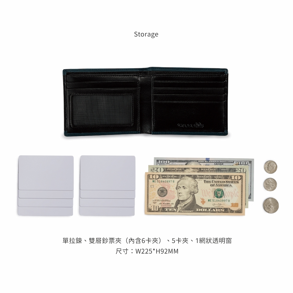 說明:單拉鍊/雙層鈔票夾(內含6卡夾)/5卡夾/1網狀透明窗