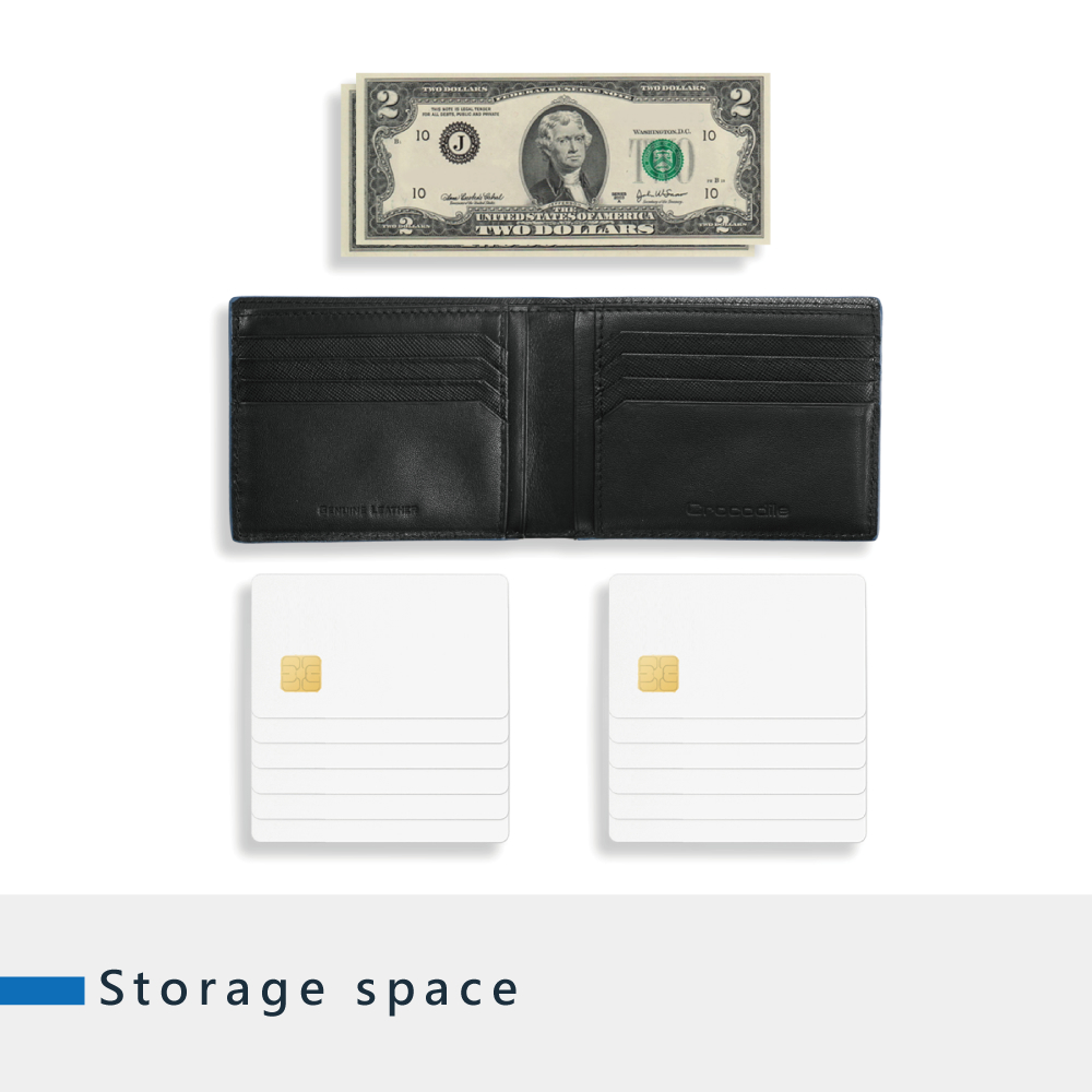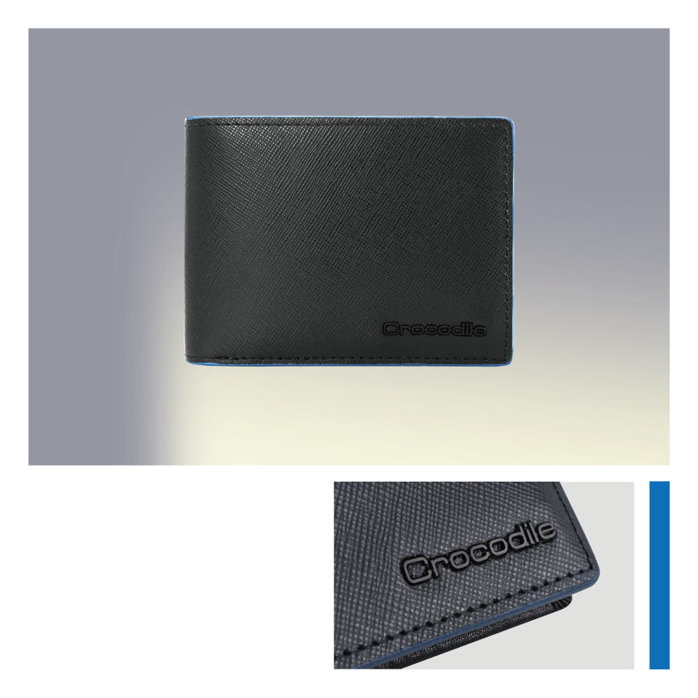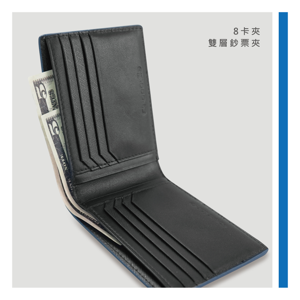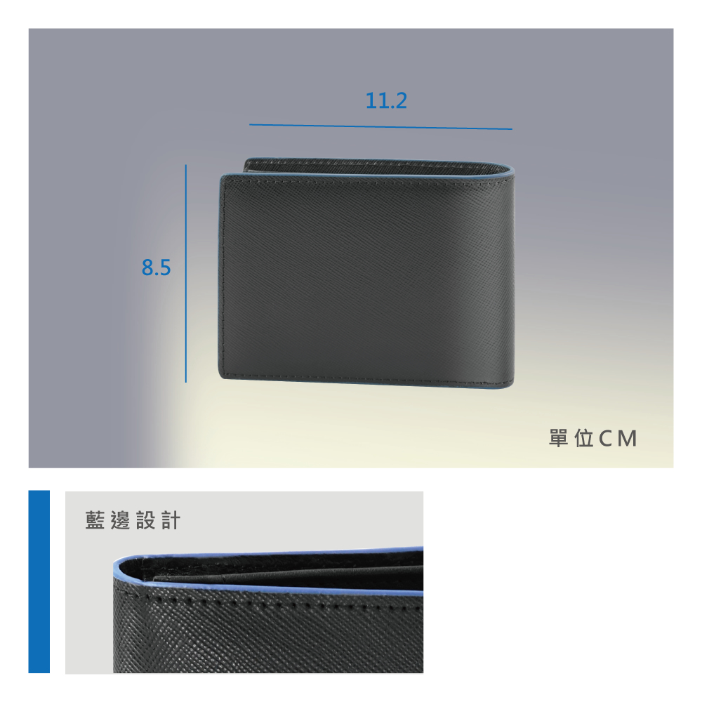 穩重黑色主體皮夾四周搭配藍色塗層。