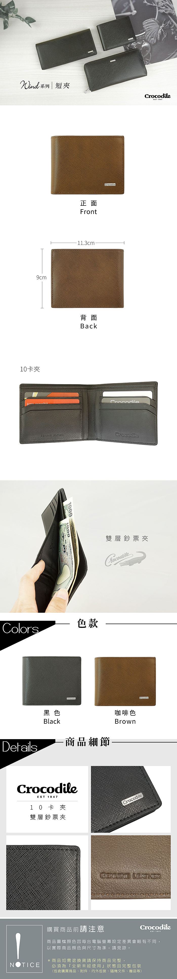 Wind系列 斜格紋 10卡 雙鈔票 短夾-0103-5904-黑咖兩色-Crocodile 鱷魚皮件