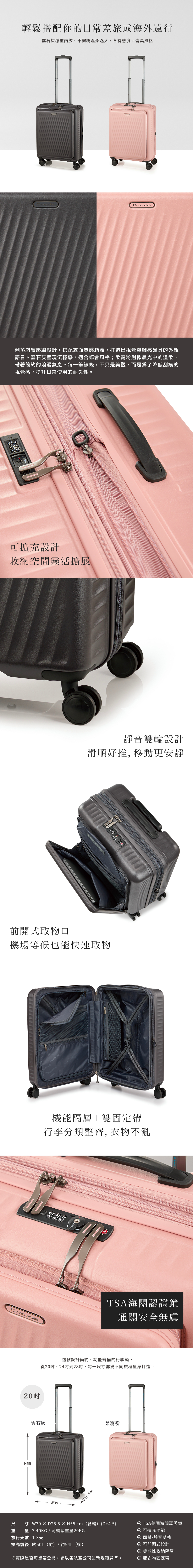 說明:TSA美國海關認證鎖/可擴充功能/四輪-靜音雙輪/可前開式設計/機能性收納隔層/雙衣物固定帶