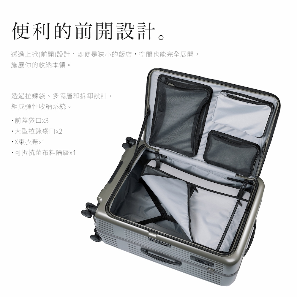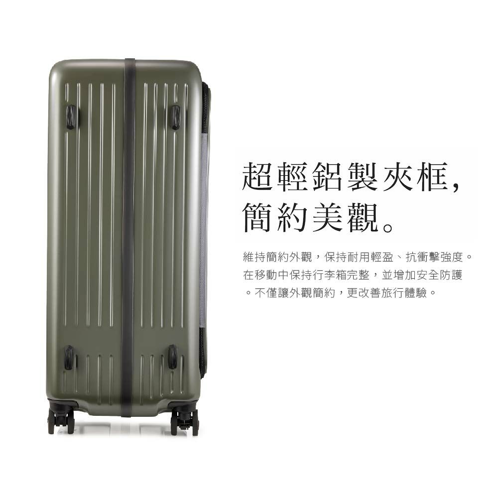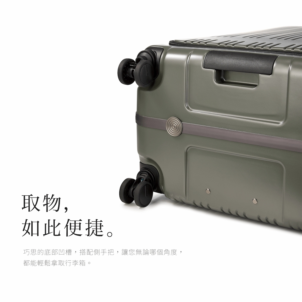採用特殊精密技術,摒棄多餘的鉚釘,使框架更輕盈且耐用,能有效抗衝擊抗擠壓。在移動中保持行李箱完整,並增加安全防護。不僅讓外觀簡約,更改善旅行體驗。