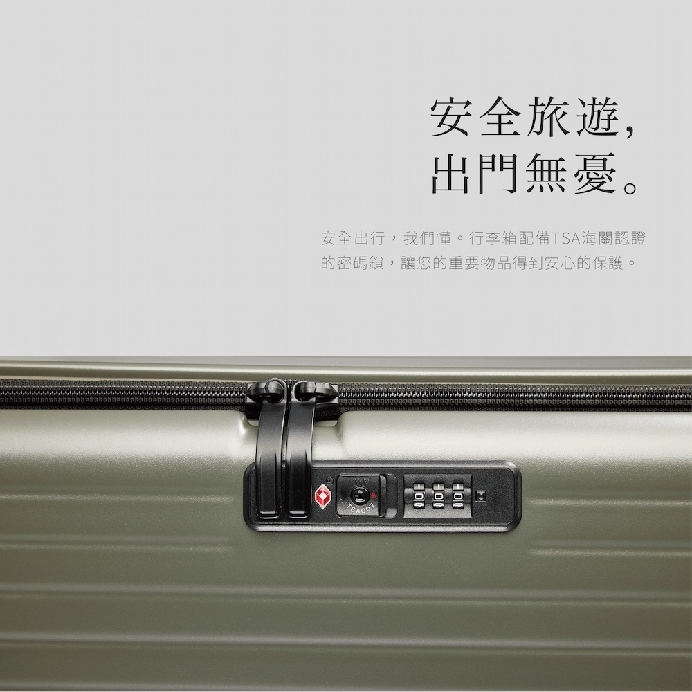 安全出行,我們懂。行李箱配備TSA海關認證的密碼鎖,讓您的重要物品得到安心的保護。