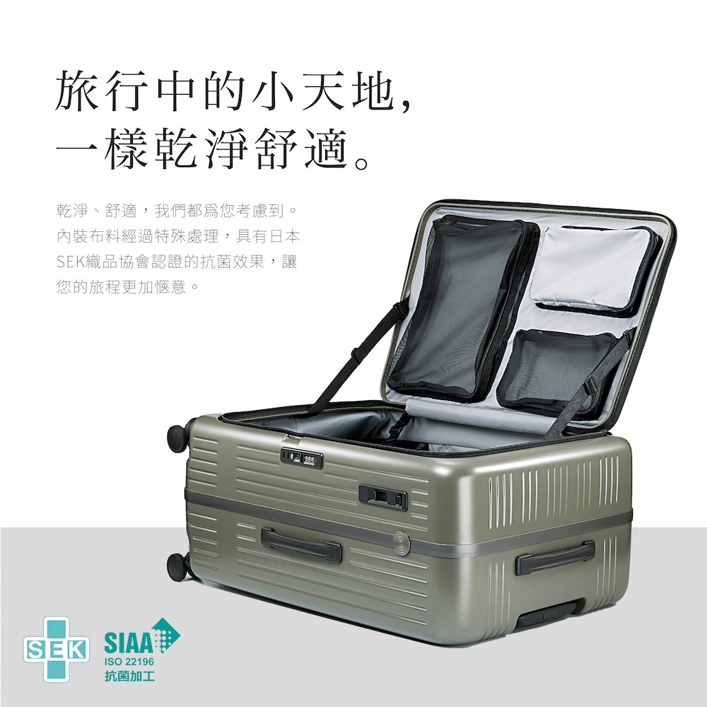 乾淨、舒適,我們都為您考慮到。內裝布料經過特殊處理,具有日本SEK織品協會認證的抗菌效果,讓您的旅程更加愜意。