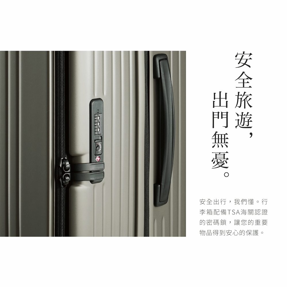 安全出行,我們懂。行李箱配備TSA海關認證的密碼鎖,讓您的重要物品得到安心的保護。