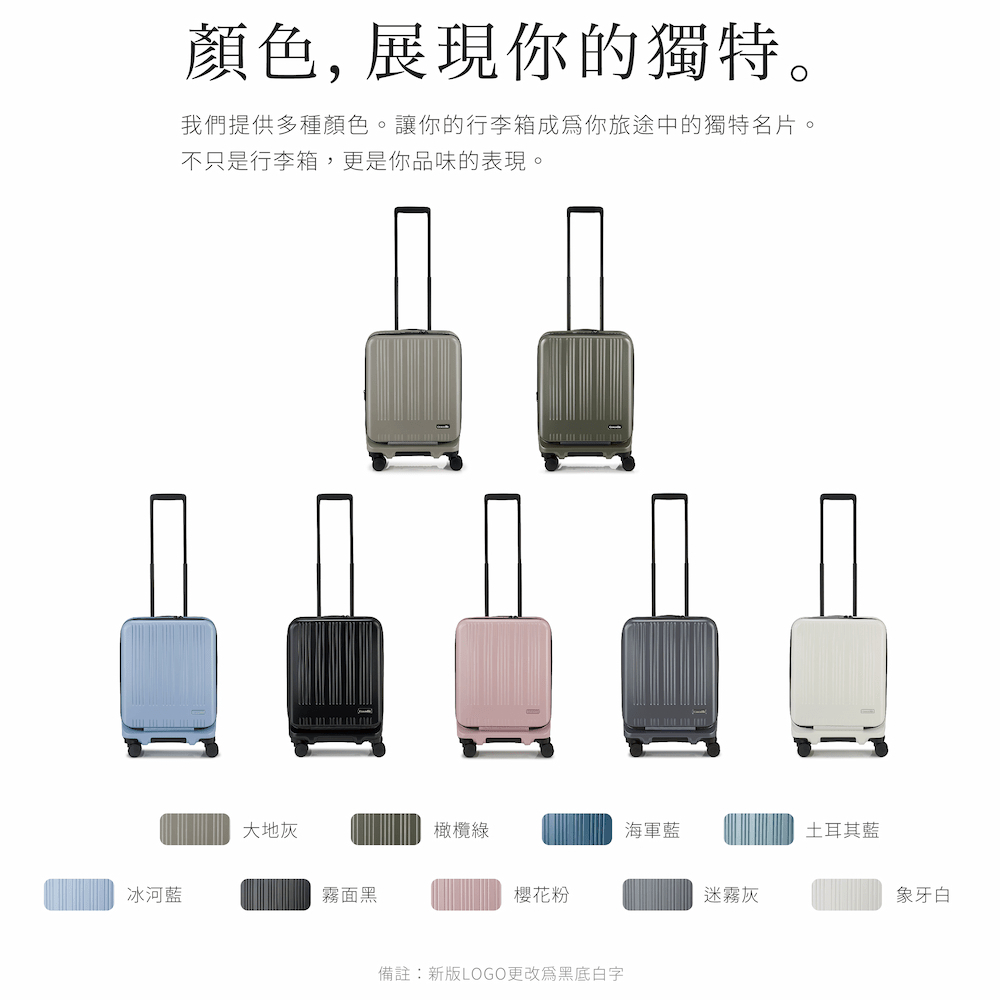 我們提供多種顏色橄欖綠、大地灰、土耳其藍、海軍藍, 霧面黑、象牙白、迷霧灰、櫻花粉、冰河藍、可選擇,讓你的行李箱成為你旅途中的獨特名片。不只是行李箱,更是你品味的表現
