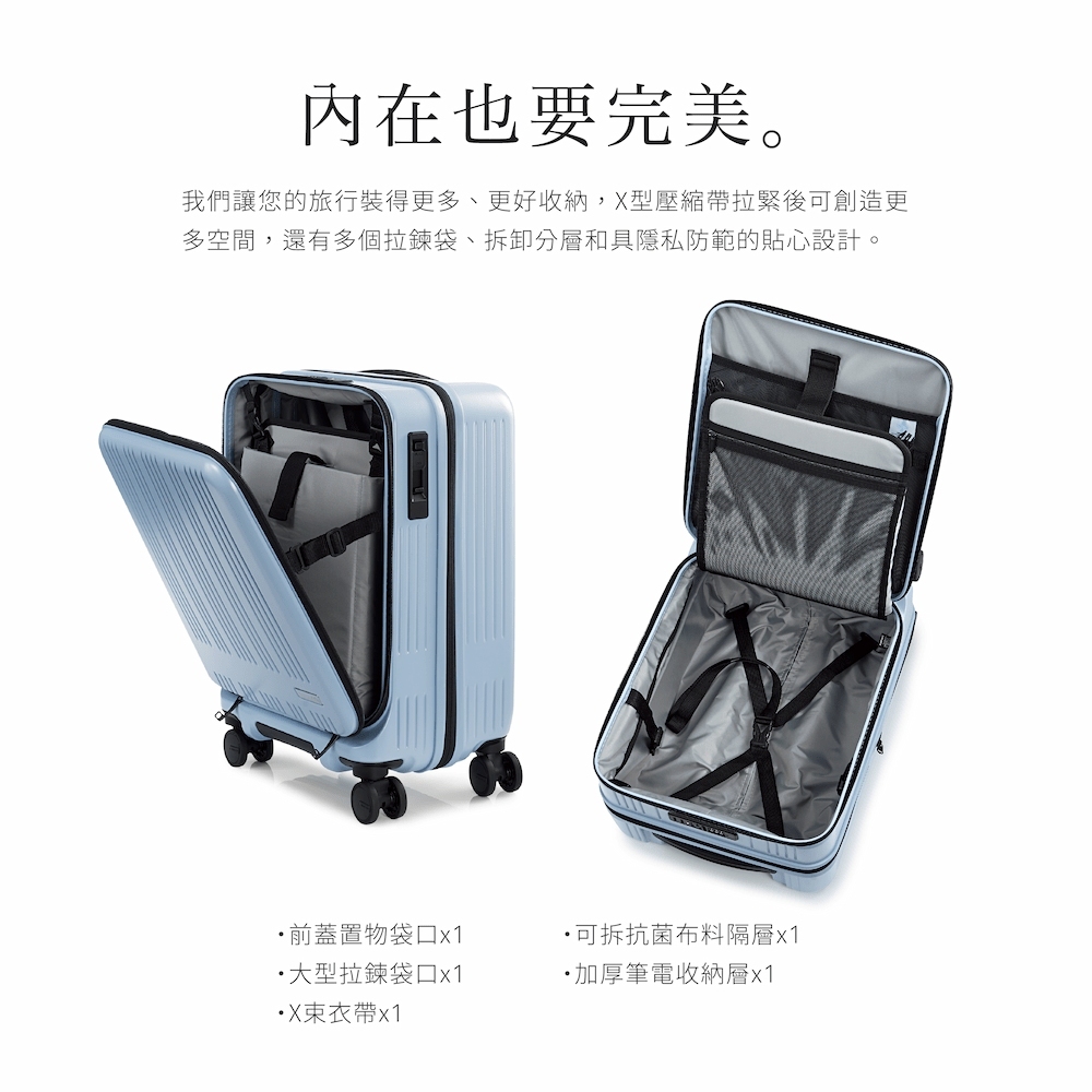 更多空間,*因尺寸不同擴增空間不同可能。我們的行李箱能增加10~15%的空間*,無論是驚喜的購物成果或臨時增加的衣物,我們都有備而來。