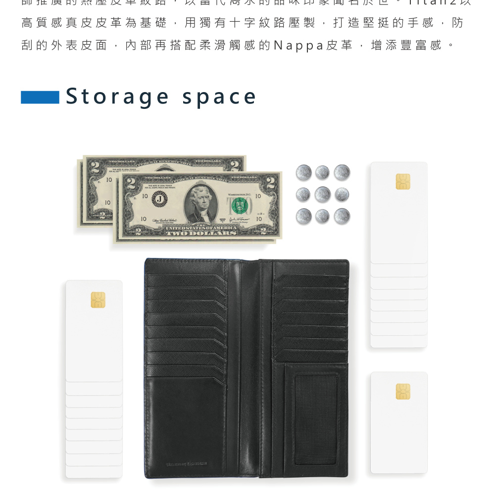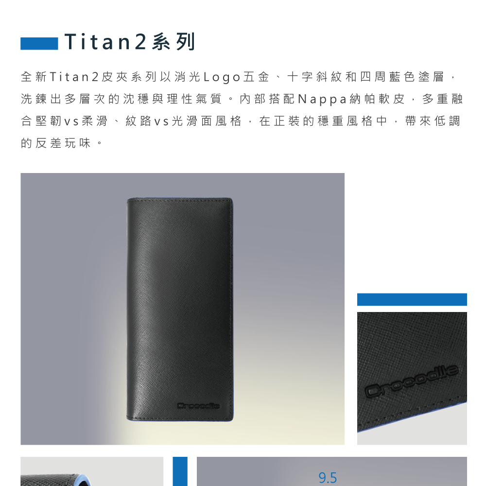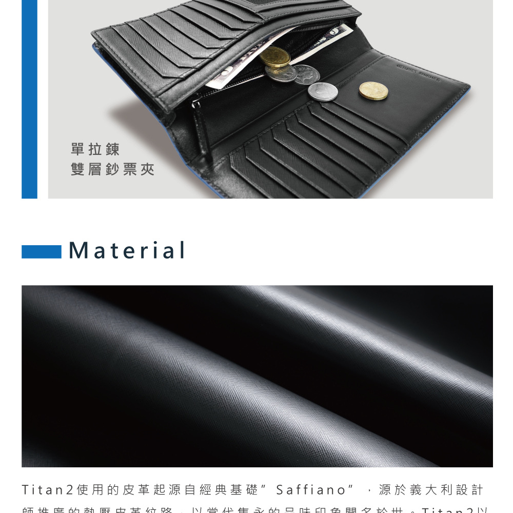 全新Titan2皮夾系列以消光Logo五金、十字斜紋和四周藍色塗層,洗鍊出多層次的沈穩與理性氣質。