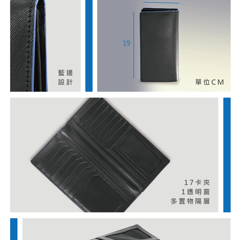 穩重黑色主體皮夾四周搭配藍色塗層。