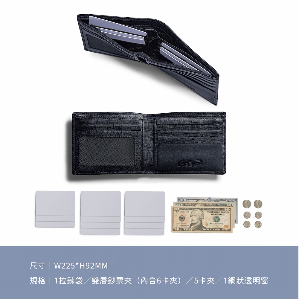 說明:1拉鍊袋/雙層鈔票夾(內含6卡夾)/5卡夾/1網狀透明窗