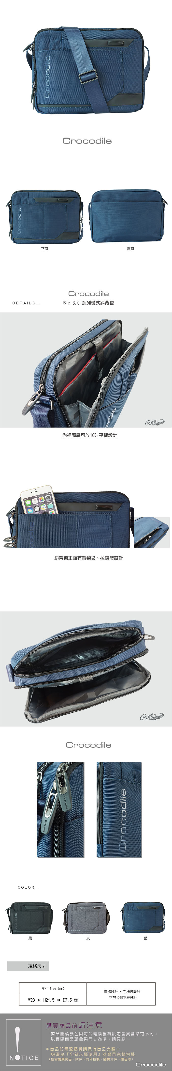 中性包包 橫式斜背/側背包推薦(L) 輕量包包 可放10吋平板 多置物袋設計 Biz 3.0系列-0104-07807-黑藍兩色-Crocodile 鱷魚皮件