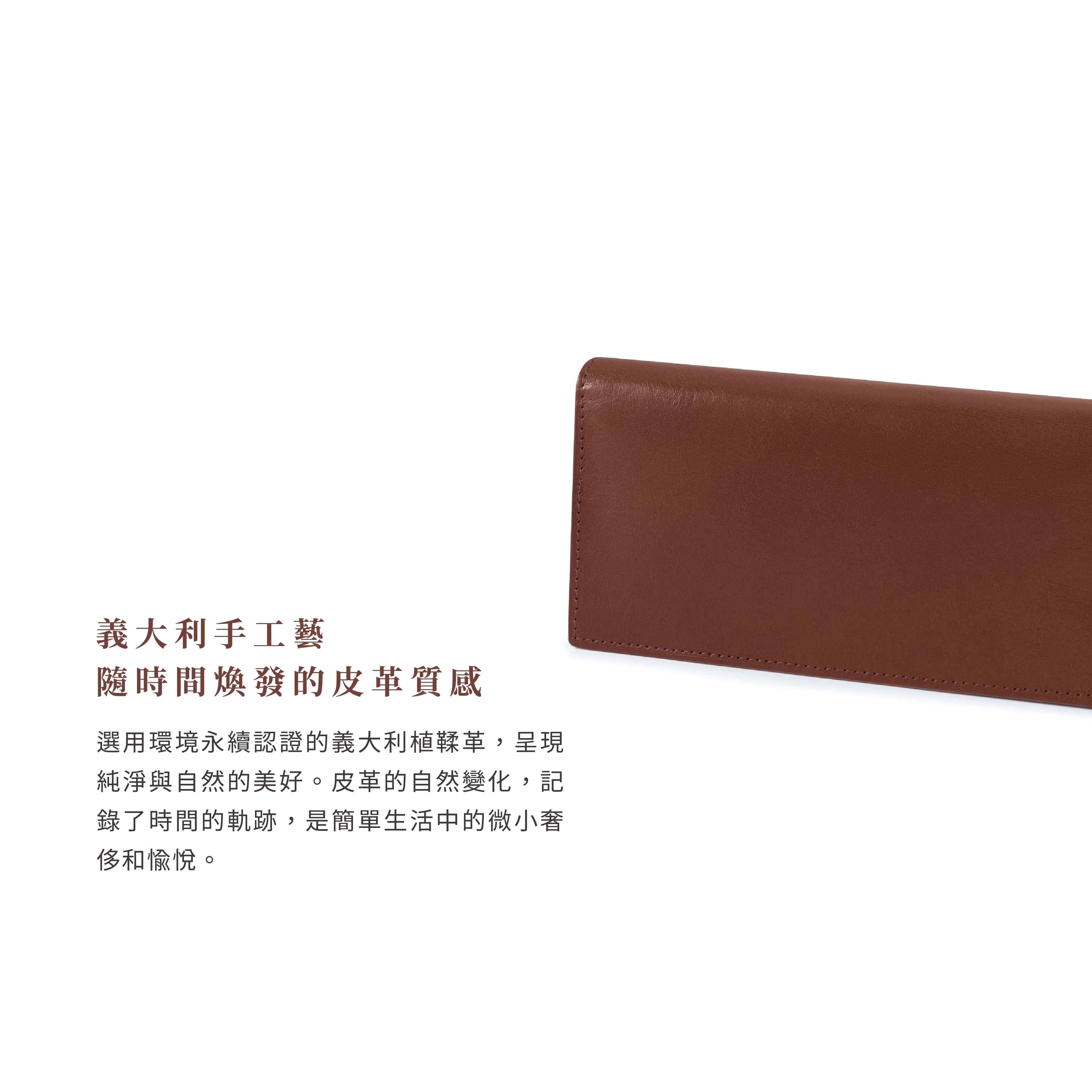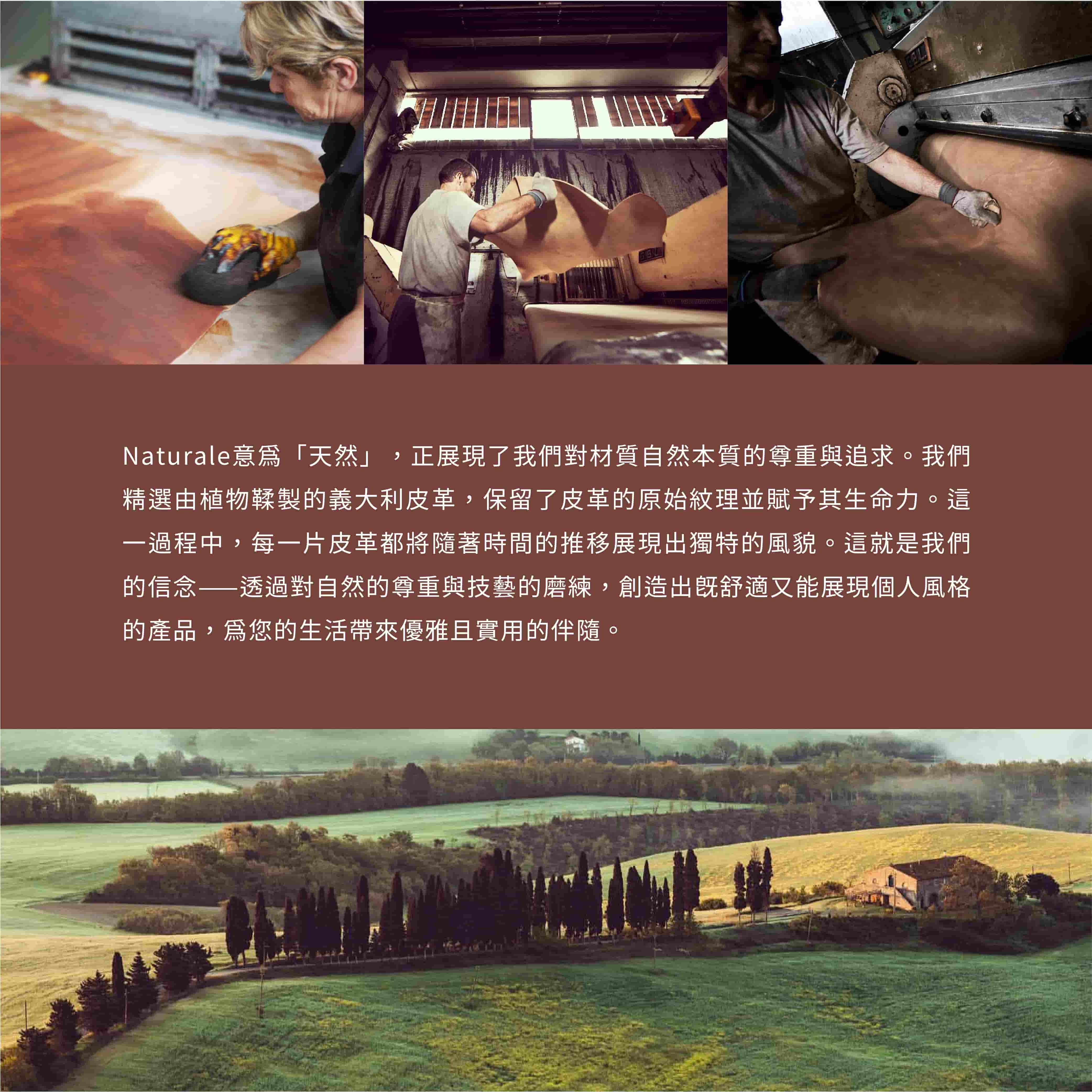 意為'天然',正展現了我們對材質自然本質的尊重與追求。我們精選由植物鞣製的義大利皮革,保留了皮革的原始紋理並賦予其生命力。這一過程中,每一片皮革都將隨著時間的推移展現出獨特的風貌。這就是我們的信念——透過對自然的尊重與技藝的磨練,創造出既舒適又能展現個人風格的產品,為您的生活帶來優雅且實用的伴隨。