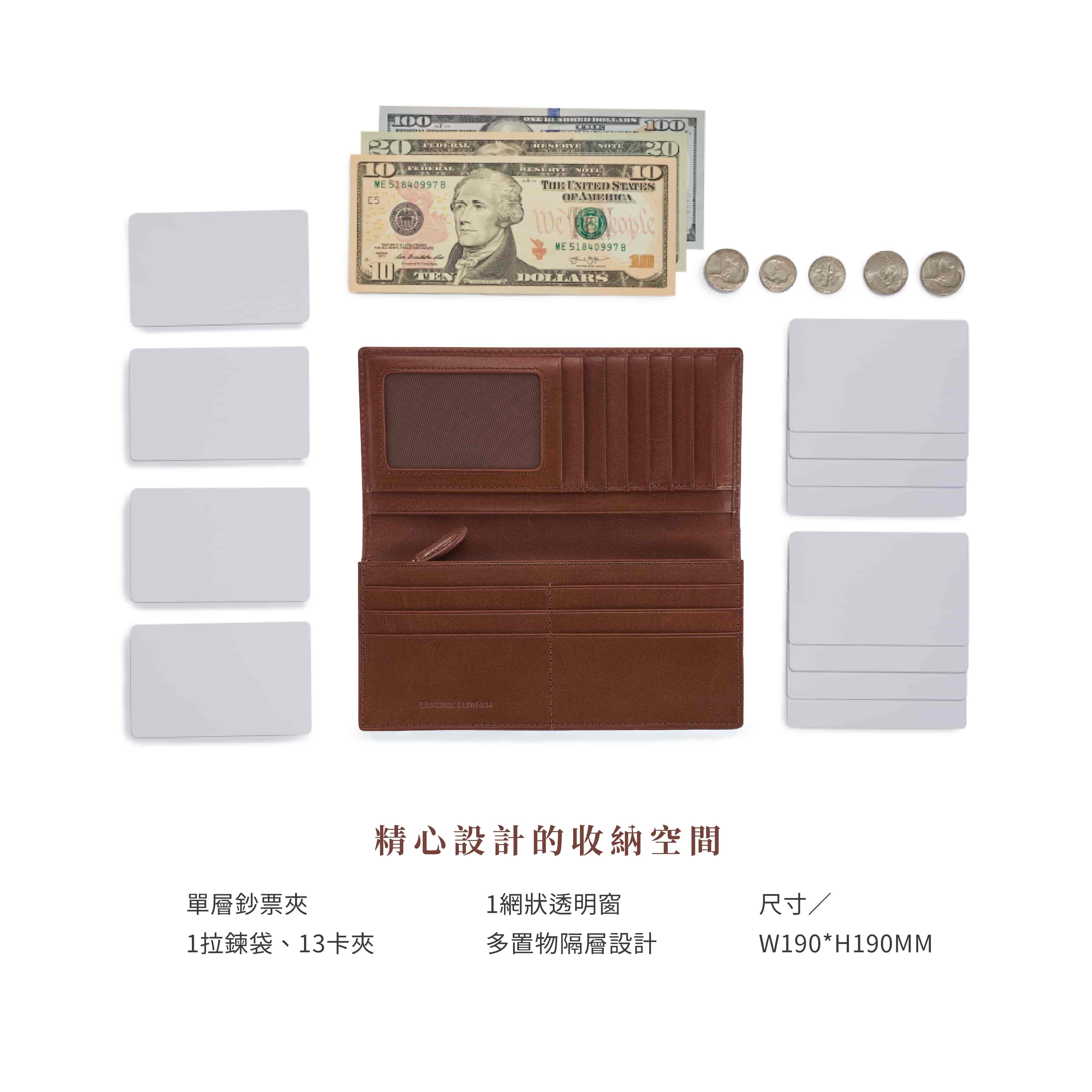 說明:單層鈔票夾/1拉鍊袋/13卡夾 / 1網狀透明窗/多置物隔層設計
