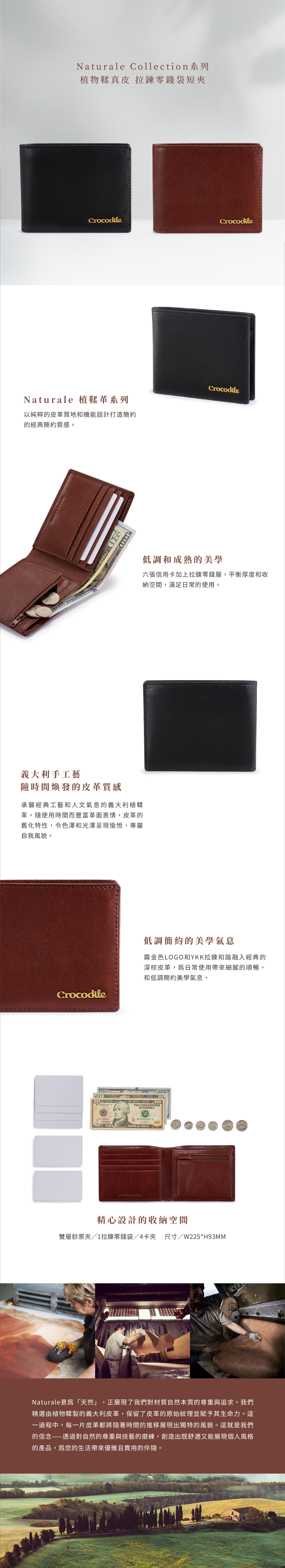 意為'天然',正展現了我們對材質自然本質的尊重與追求。我們精選由植物鞣製的義大利皮革,保留了皮革的原始紋理並賦予其生命力。這一過程中,每一片皮革都將隨著時間的推移展現出獨特的風貌。這就是我們的信念——透過對自然的尊重與技藝的磨練,創造出既舒適又能展現個人風格的產品,為您的生活帶來優雅且實用的伴隨。