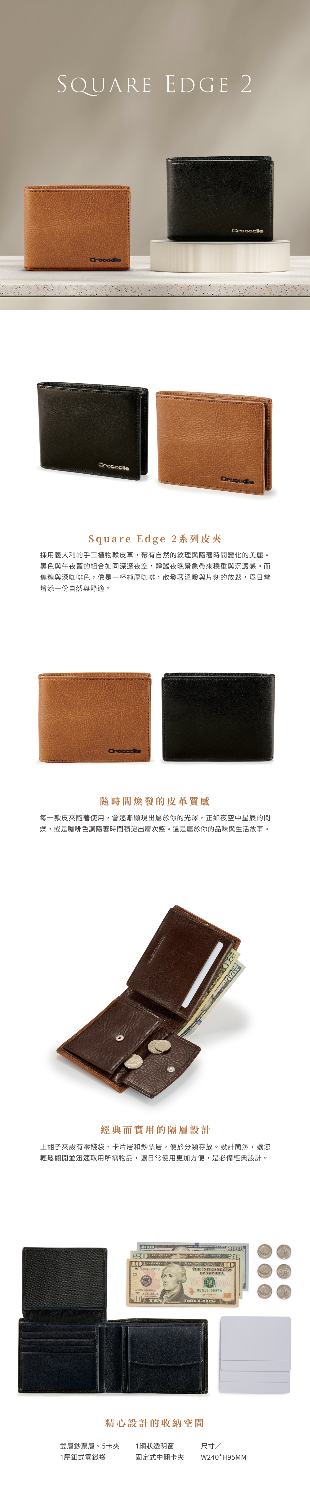 說明:雙層鈔票夾/1壓釦式零錢袋/5卡夾/1網狀透明窗/固定式上翻卡夾