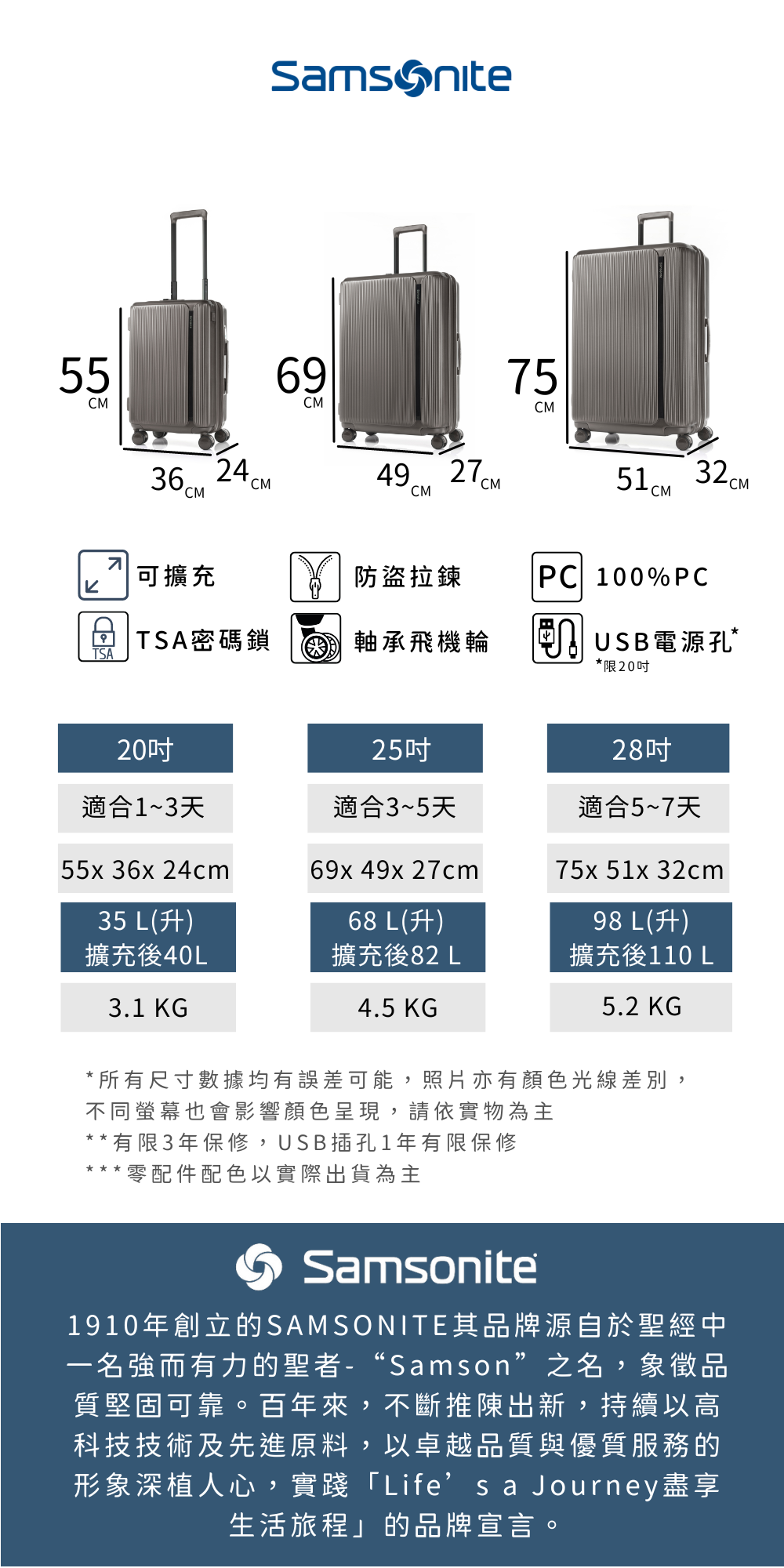 1910年創立的SAMSONITE其品牌源自於聖經中一名強而有力的聖者-“Samson”之名,象徵SAMSONITE產品的堅固可靠。百年來,SAMSONITE不斷推陳出新,產品拓展到公事包、電腦包、戶外背包、仕女提包、兒童系列、皮夾、旅行配件、日用包袋等領域,並持續以高科技技術及先進原料,以卓越品質與優質服務的形象深植人心,實踐「Life’s a Journey盡享生活旅程」的品牌宣言。
