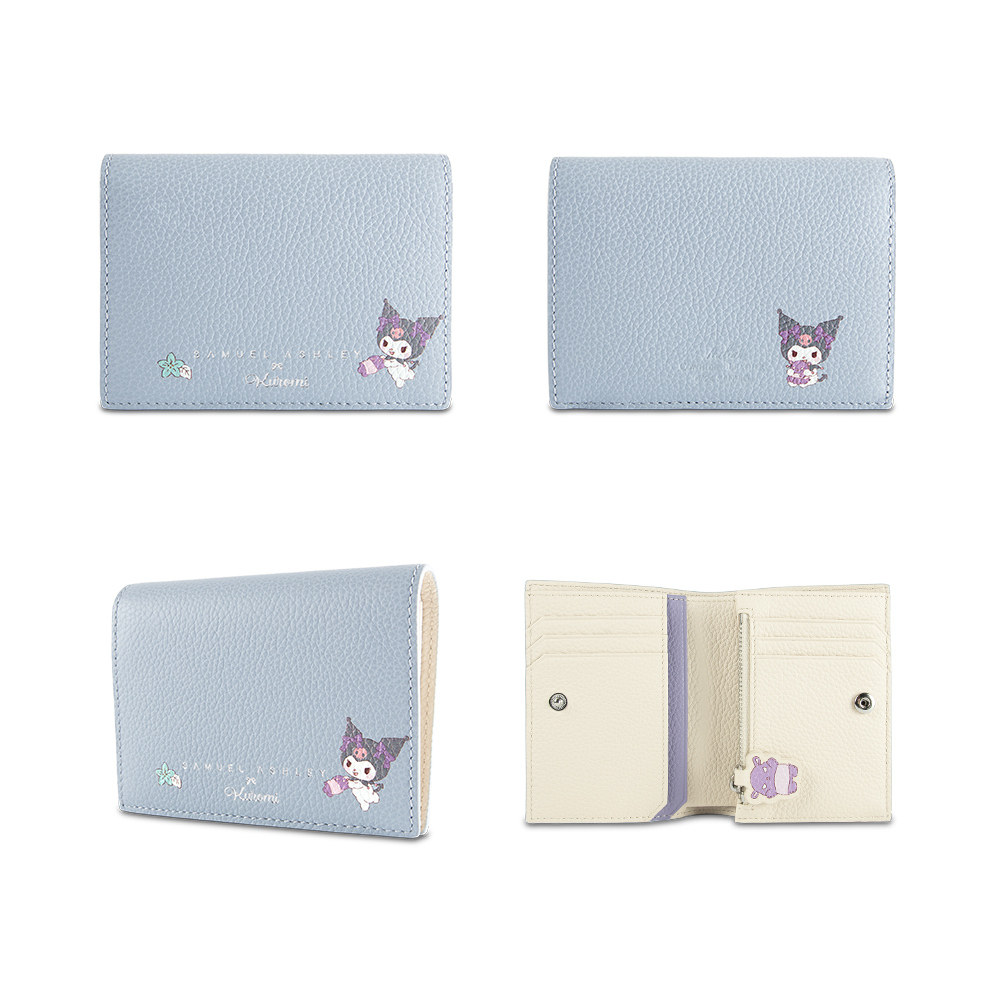 摺疊式皮革短夾推出米白、冰藍及深灰三款色調,設有9個卡夾層、1個拉鍊零錢袋及1鈔票格,採用正面採鈕扣鈕開合設計,配有拉鍊皮革拉鍊片及銀色配件