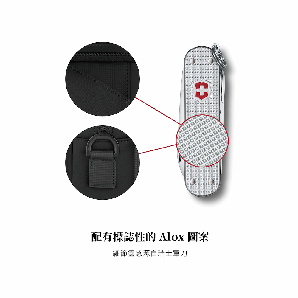 結合低調質感與高機能。採 ROBIC® 耐磨防潑尼龍,輕盈耐用;內襯 Sivaldur 抗菌布料,清楚辨識內容物。側邊配備專屬瑞士刀殼,並可客製化,打造個人風格。