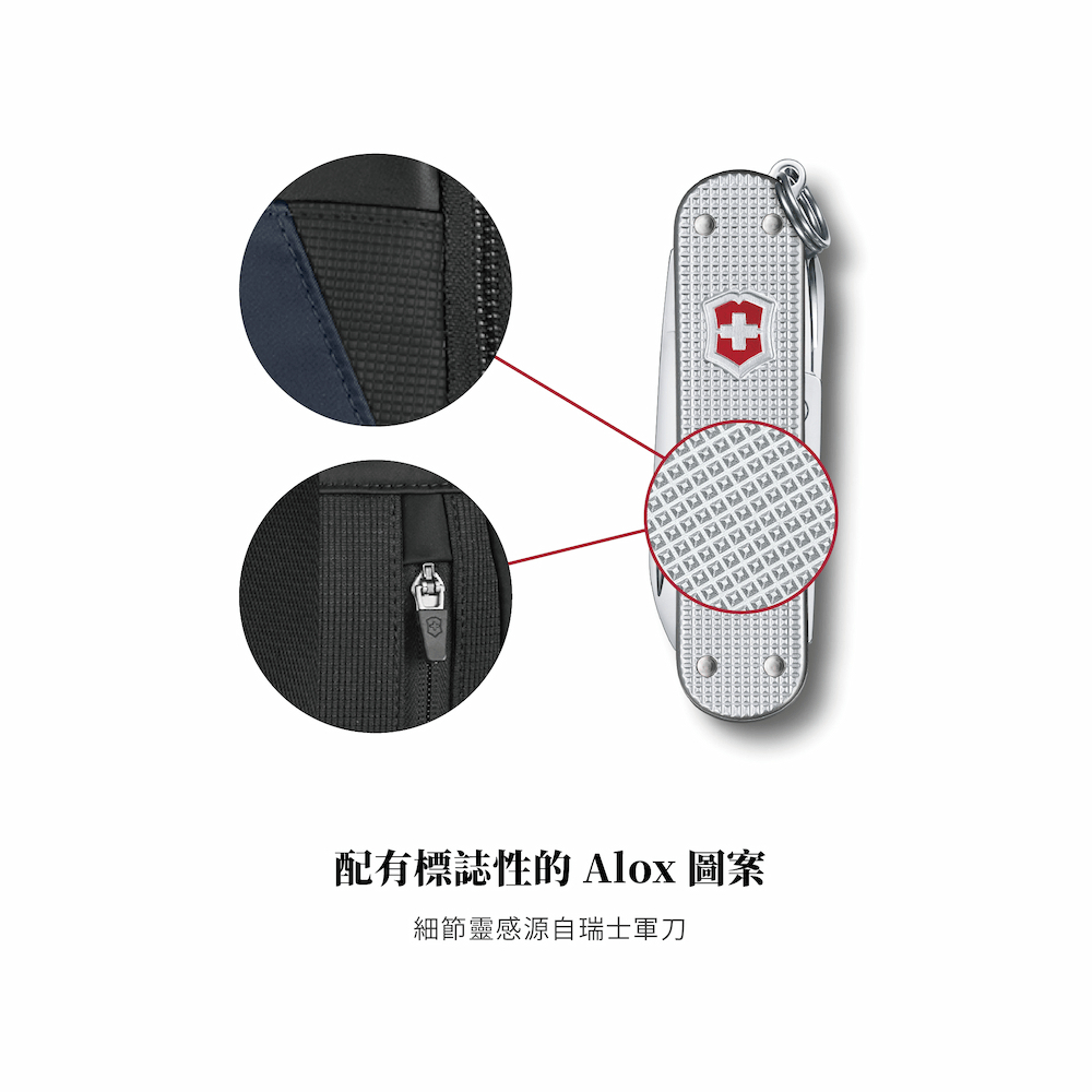 結合低調質感與高機能。採 ROBIC® 耐磨防潑尼龍,輕盈耐用;內襯 Sivaldur 抗菌布料,清楚辨識內容物。側邊配備專屬瑞士刀殼,並可客製化,打造個人風格。